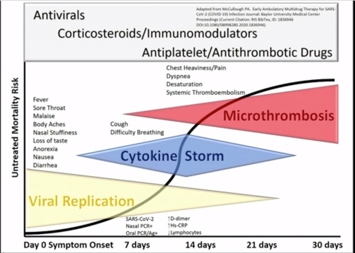 Despite the constant ‘get vaccinated’ drumbeat, Americans are still getting Covid-19—even the vaccinated. The above graph was provided by U.S. Senator Ron Johnson in his December 8, 2020 committee hearing on early treatment for COVID-19. It shows three stages of infection. It’s important to stop the viral replication stage, thereby avoiding the dangerous cytokine storm and the microthrombosis (mini-clots) stages. Options for receiving early treatment, including ivermectin or hydroxychloroquine (HCQ), and videos from physicians using these medications, can be found here if an individual cannot find access to early treatment elsewhere:
